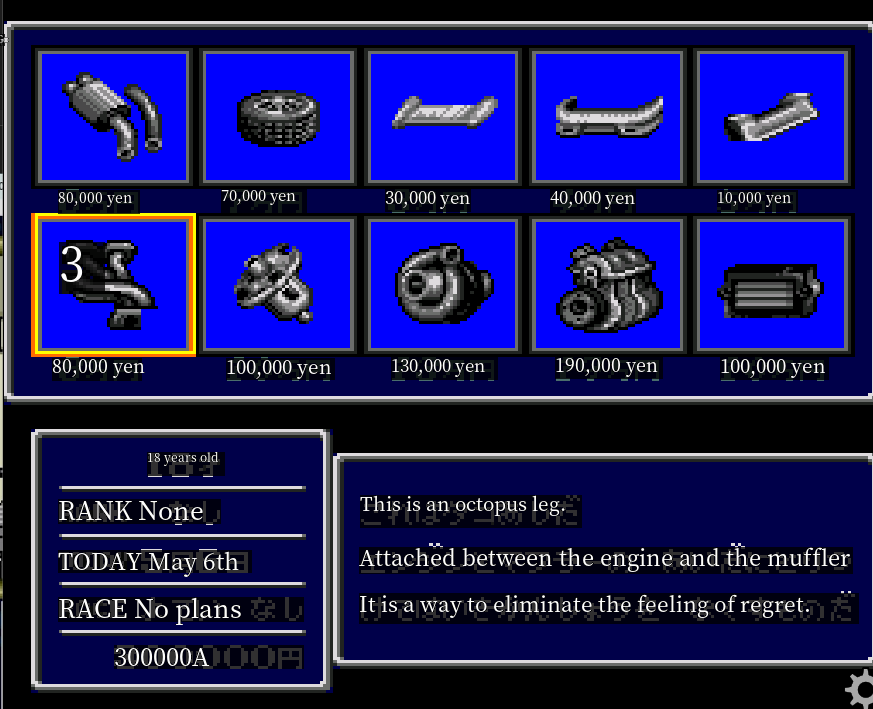 To help this, I've run the translator on each of the options, to both get the amusing descriptions, and give us an idea of capability. We have 300,000 yen to work with, so let's work wisely.