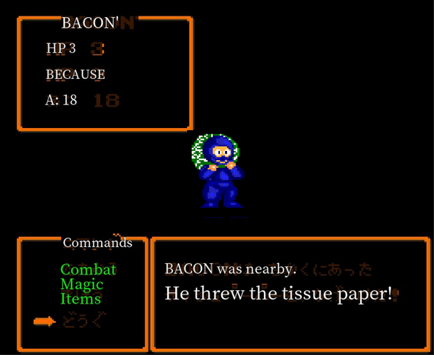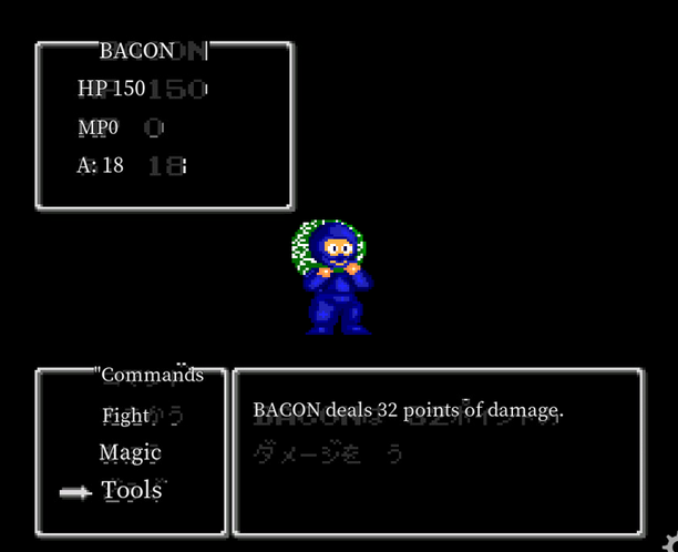 We see on the top left that Hiro (yes, it says Bacon - I regret not setting that as my name) has 150 Health Points, 0 Magic points and 18... whatever ‘A’ is.