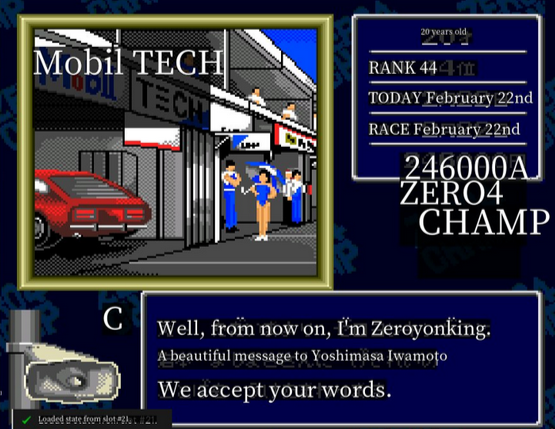 Alright. Time to take this baby to the track! To keep up the tradition with naming his cars after women, Hiro’s named her ‘Skye’.