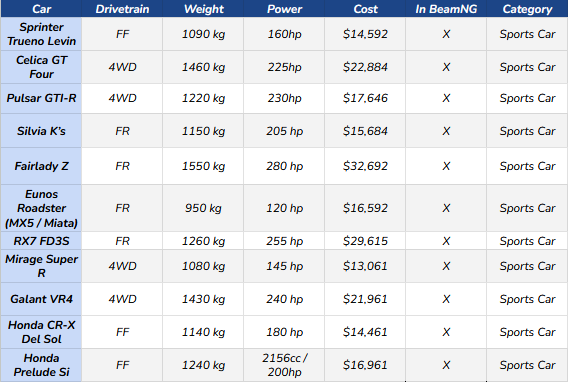 This time around, we want something a bit more serious this time to compete in the higher tiers, so I’ve removed the Kei cars and the off-road four wheel drive cars. (Seriously, why are they in this game?)