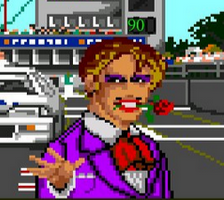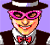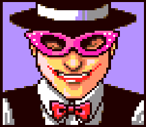 Gah! Who’s this guy? I’m guessing he’s the blackjack dealer. With his big Elton John indoor sunglasses, Fedora and Joker makeup, he doesn’t really appear like someone we should trust…