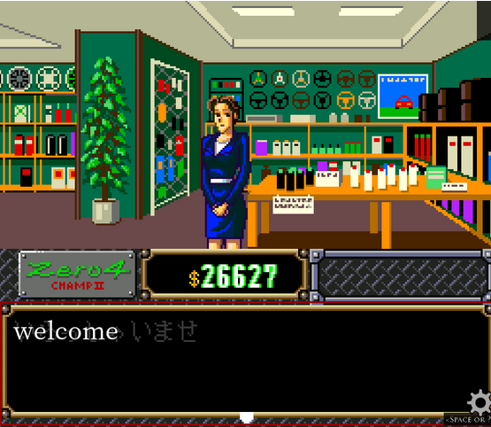 Ooh. This shop is different to all the others. Instead of a beige wall we have green. And the rockabilly loving mechanic / attendant is a girl.