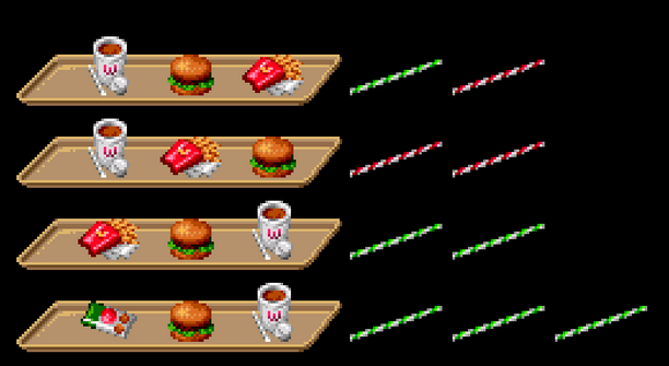 Thanks to the help from Goons last time I think I get this now. These two green straws meant that we have at least two food items in the right position, and one food item is incorrect. There are no red straws, but if there were, it would mean there is a correct item in the wrong position.