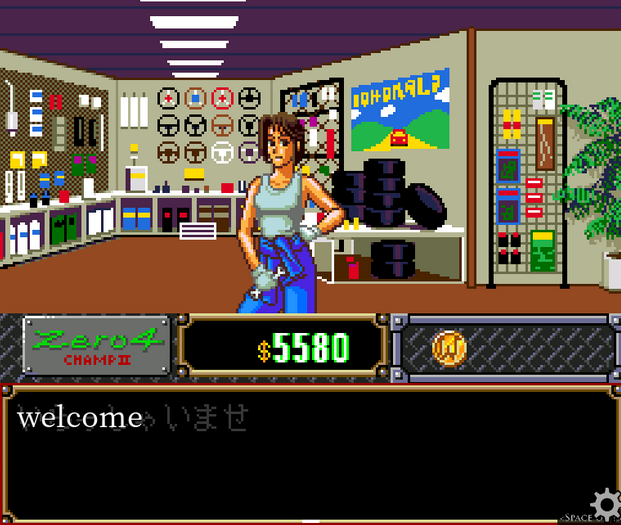 Alright, it's another car store that's pumping out the rockabilly tunes. The shopkeeper here is definitely dual purposing as a mechanic. She's half out of her overalls and wielding a wrench.