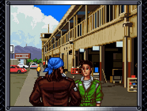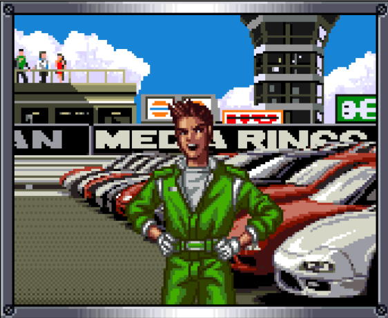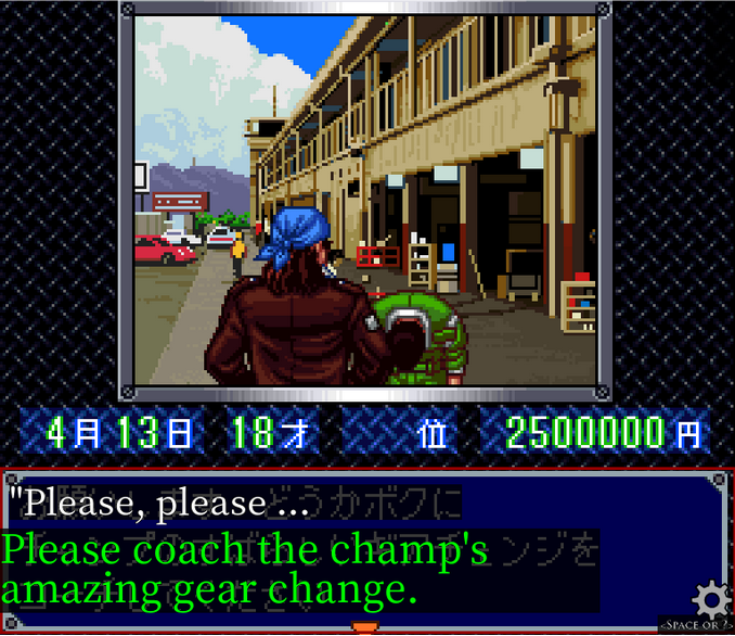 Seems like this guy in the green race suit is pleading with someone in a leather jacket and a bandana to teach them the Champs gear changing techniques.