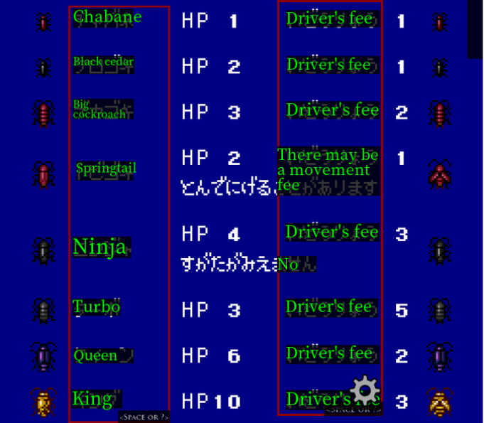 This appears to be our enemy list. We've got several different varieties of cockroaches to contend with. Each one also apparently has a corresponding drivers fee…