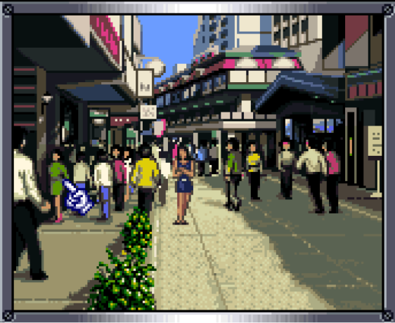 I notice another lady is standing in the corner there, with a green dress and pink shoes. She doesn't look like she should be interactable, since she's clearly baked into the background drawing, unlike our current girlfriend.