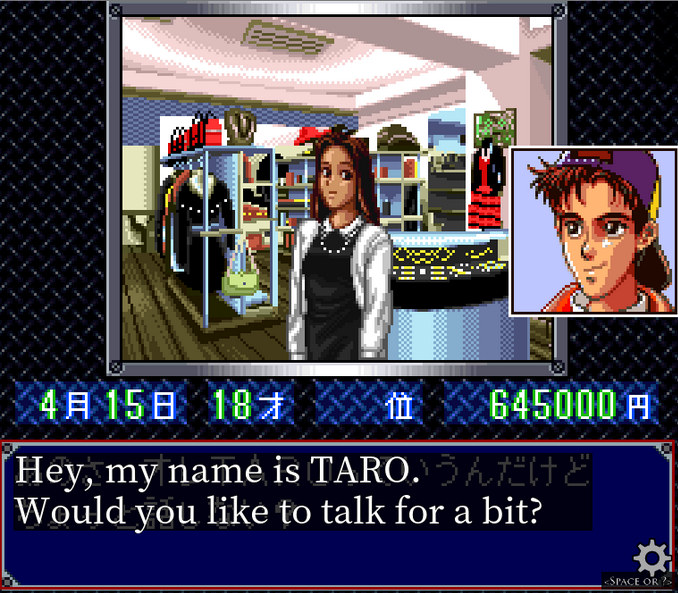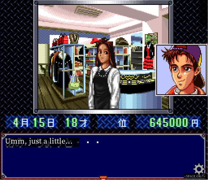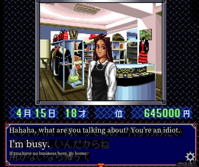 We transition to some sort of clothing / jewelry shop. Our new girlfriend doesn't appear to actually be the green dress girl, but someone else entirely.
