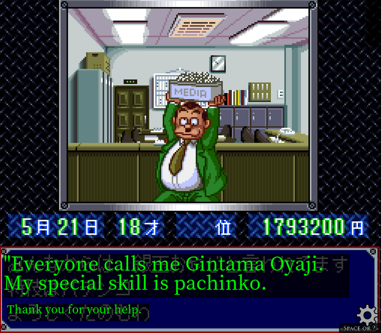 : Everyone calls me Gintama Oyaji. My special skill is pachinko. Thank you for your help.