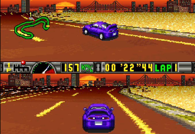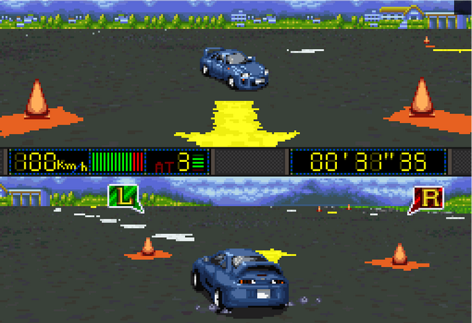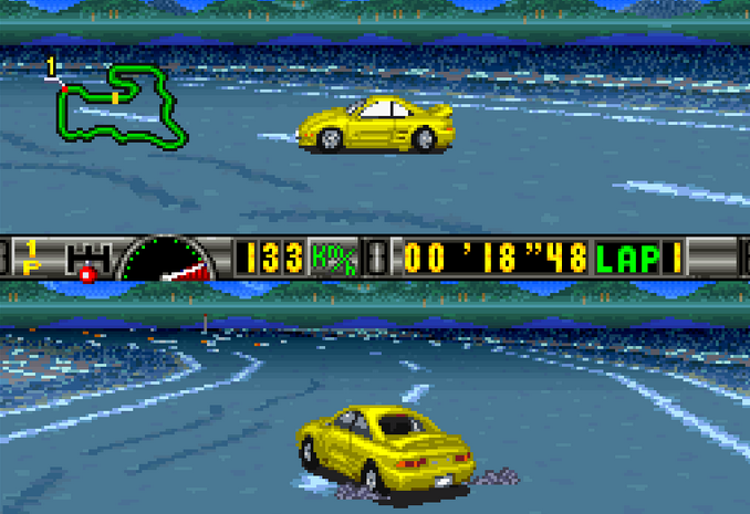 Released late in the console's life, these games were getting the most they could out of the aging hardware. I particularly love the sprite based external camera on the top half of the screen, which can also be switched to be a rear vision camera. There must have been a technical reason why these games did this split screen thing all the time - Super Mario Kart did the same, though they fill the area with a map.