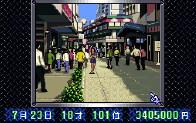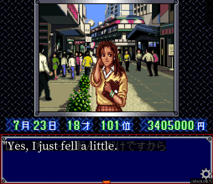 Well. This place doesn't look much different than most times we've been here. Sayaka isn't here any more. The girl in the blue dress is, and I presumably can still click on the buildings at the left there to visit the Shopkeeper.