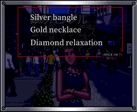 Oh, we can finally use all that jewelry we bought from the Shopkeeper ages ago! I tried doing this back then and it wouldn't let me do it, so we were equipping them to crush skulls in the JRPG mode instead.