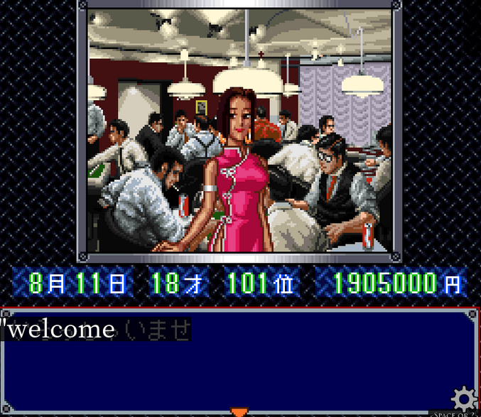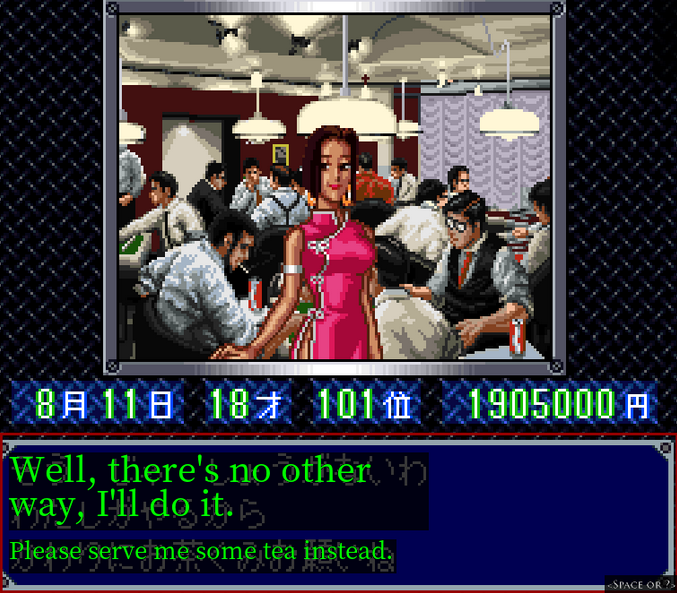 What is this place? Looks like some sort of smokey gamblers den… Seems it's got a pretty strict dress code - all the men are in shirts and ties and this lady is in a fancy kimono.