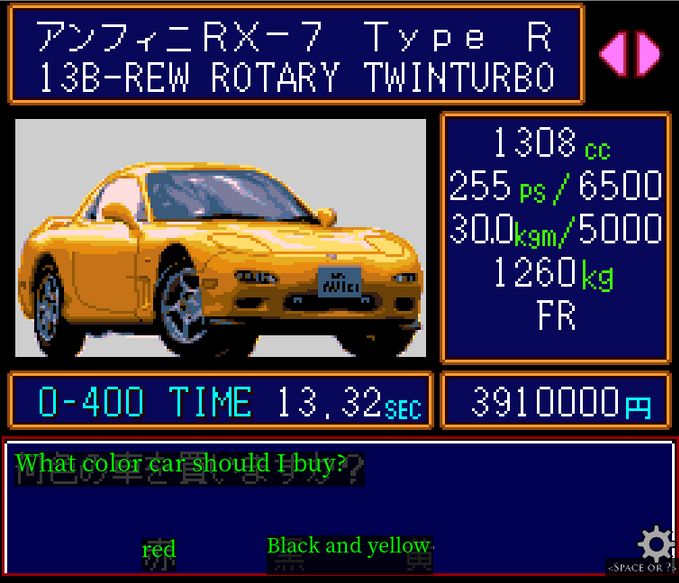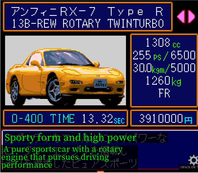 The canonical reason we can't reuse parts on this (presumably) final tier of cars is that they are ‘2000cc and up’. Thing is, the RX7 is actually 1300cc. I guess they count it because of its awesomeness and unconventional engine.