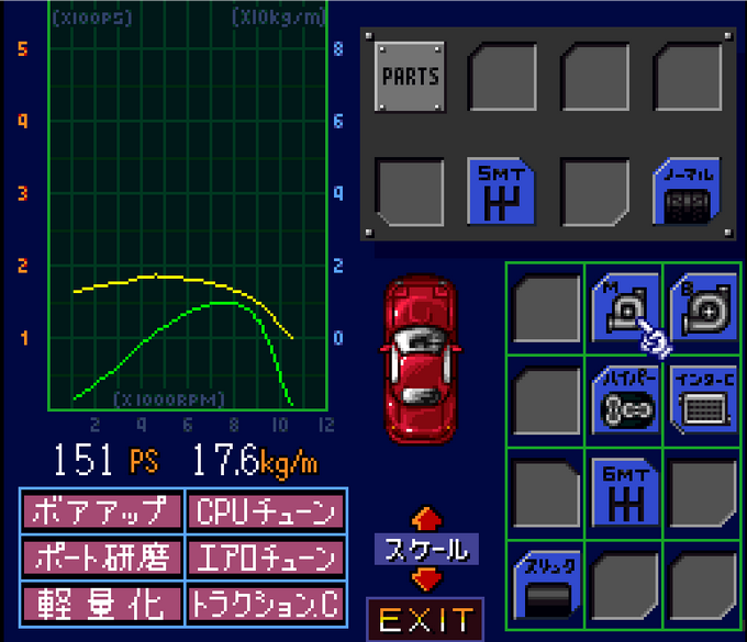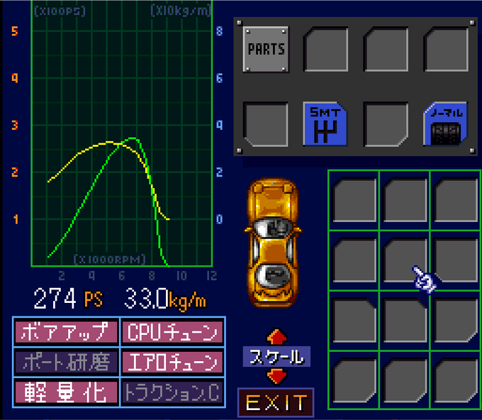 There's 1,194,200 yen left after buying the car. We'll start by buying light-weighting and aero tuning, which should leave 424,200 left.