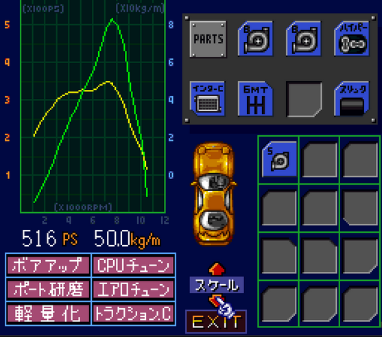Hopefully this is what we need to fix our performance issues. It seems consistent throughout the game that the other car always beats us on initial acceleration, and our power advantage comes through when the big turbos kick in. Zero 4Champ 2 was all about tuning the car to minimise wheel spin in the different dry / wet / ice conditions, so it fits we have to do it here, and perhaps it's a bit more nuanced since it appears this game is dry course only.