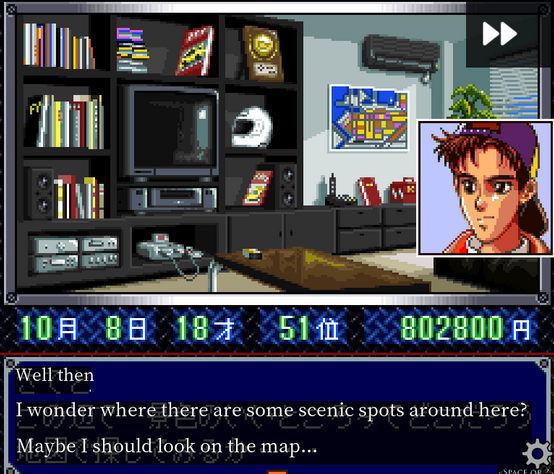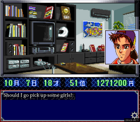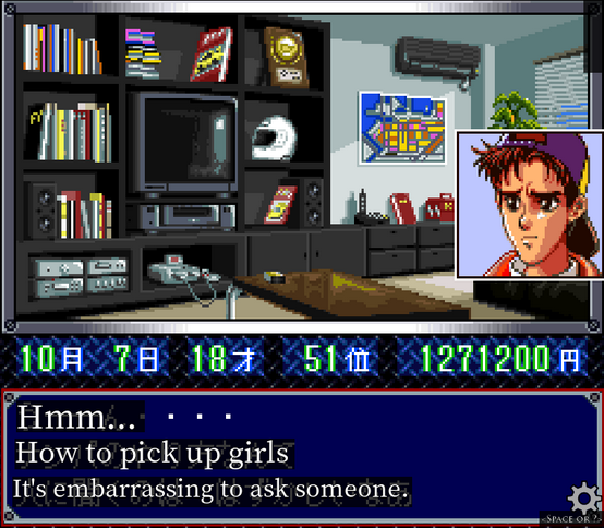 The usual job / parts / racing shortcuts don't seem to be responding to clicks anymore, so I guess our mission now is to find something here that will help Taro have some success in dating.
