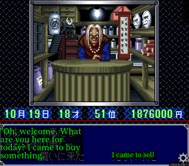 Let's buy a whole assortment of weapons and armour. I had kind of forgotten this option existed, because it's painful and time consuming to translate so many lists of items and explanations of their effects. It has been quicker just to brute force it.