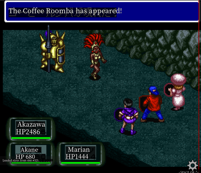 Wandering through the dungeon we trigger random encounters, with enemy types that are variants of ones we've seen before, but with suitably more badass names, like the demonic messenger, the death plant and the aforementioned Coffee Roomba.
